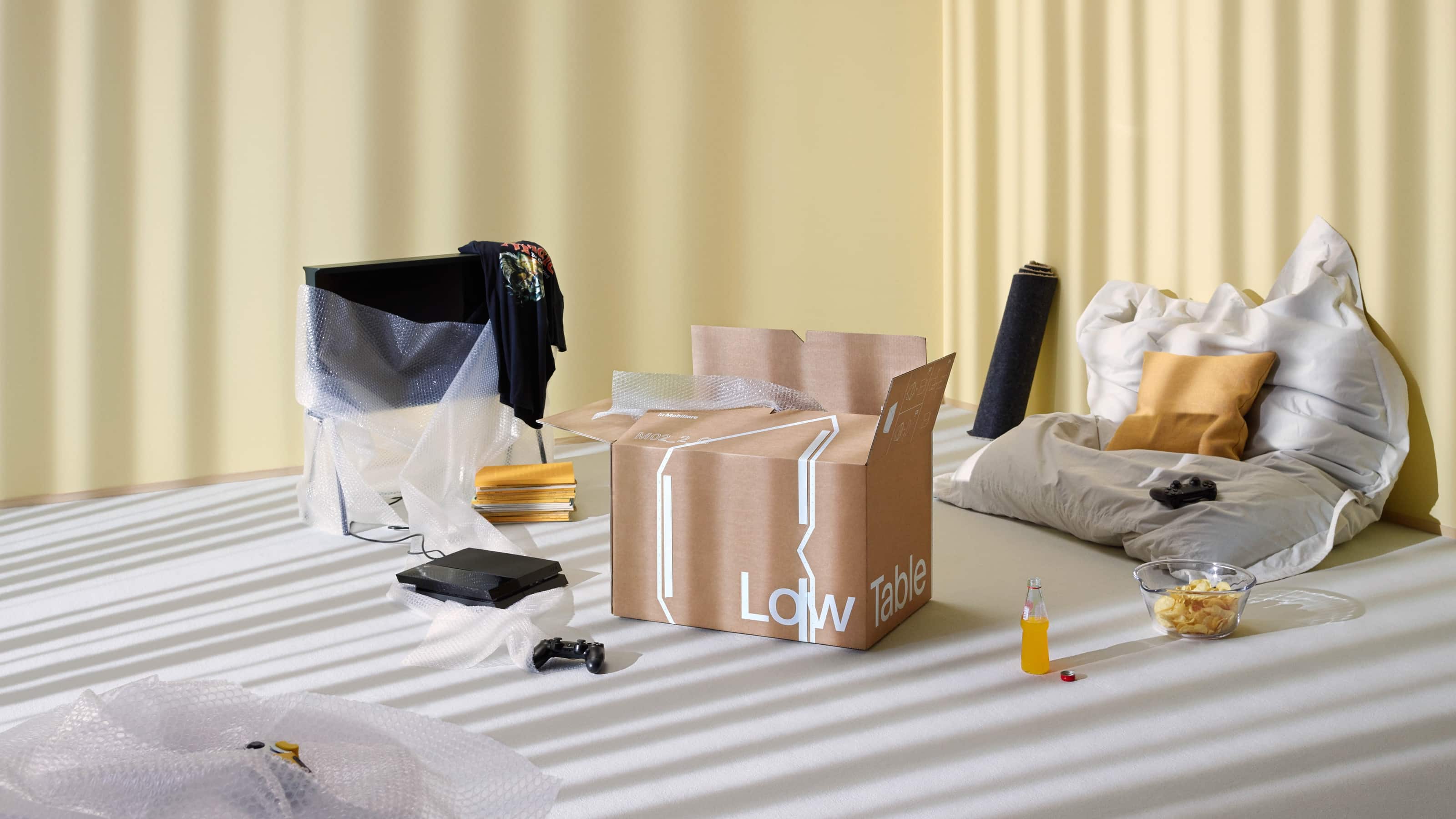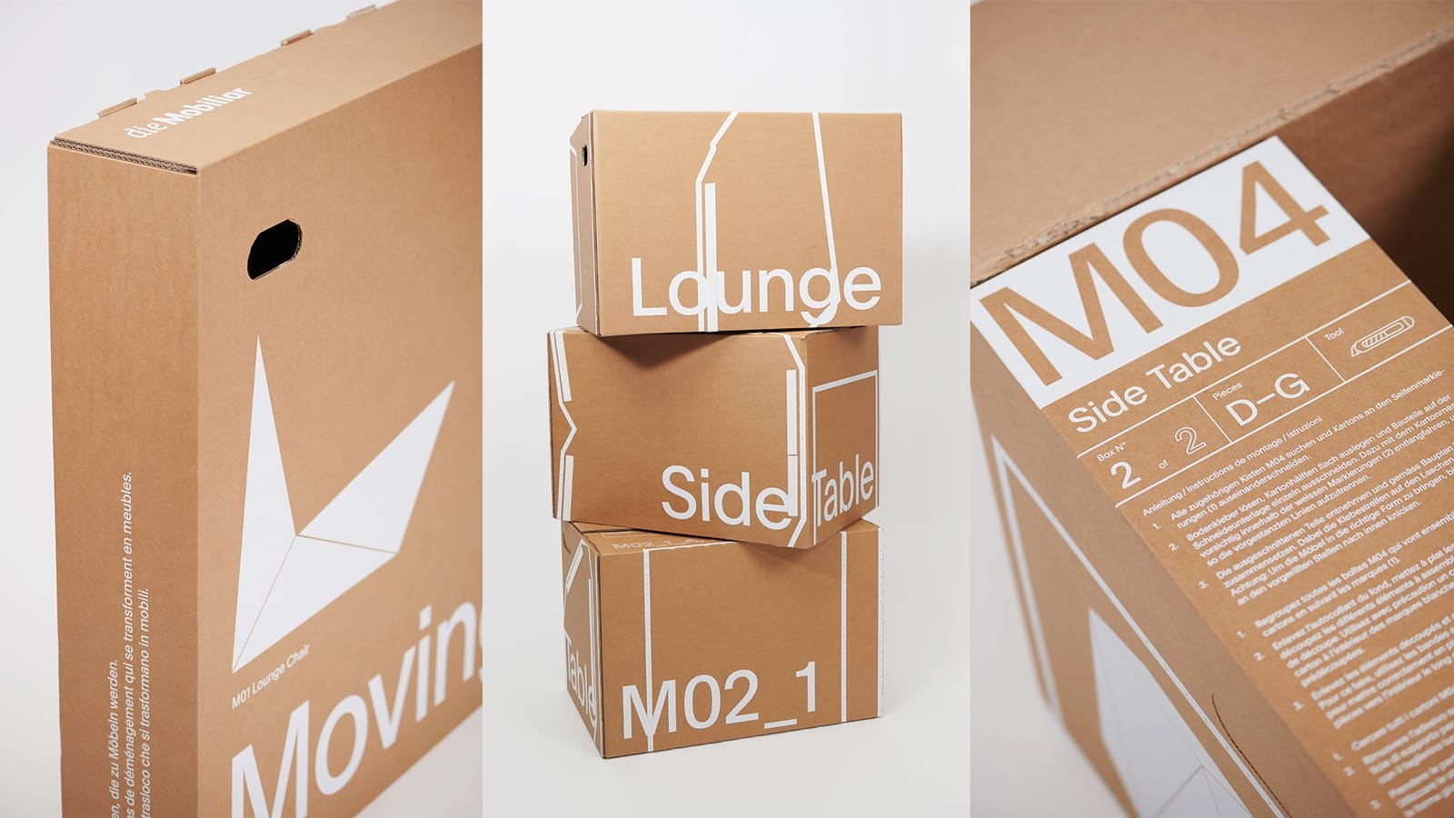 Pamu Design the 10 moving boxes can create 2 Seats, a sidetable and a lowtable. Through the graphic design placed on the Boxes we not only create unique character but also show the instruction for the assembly of the boxes.